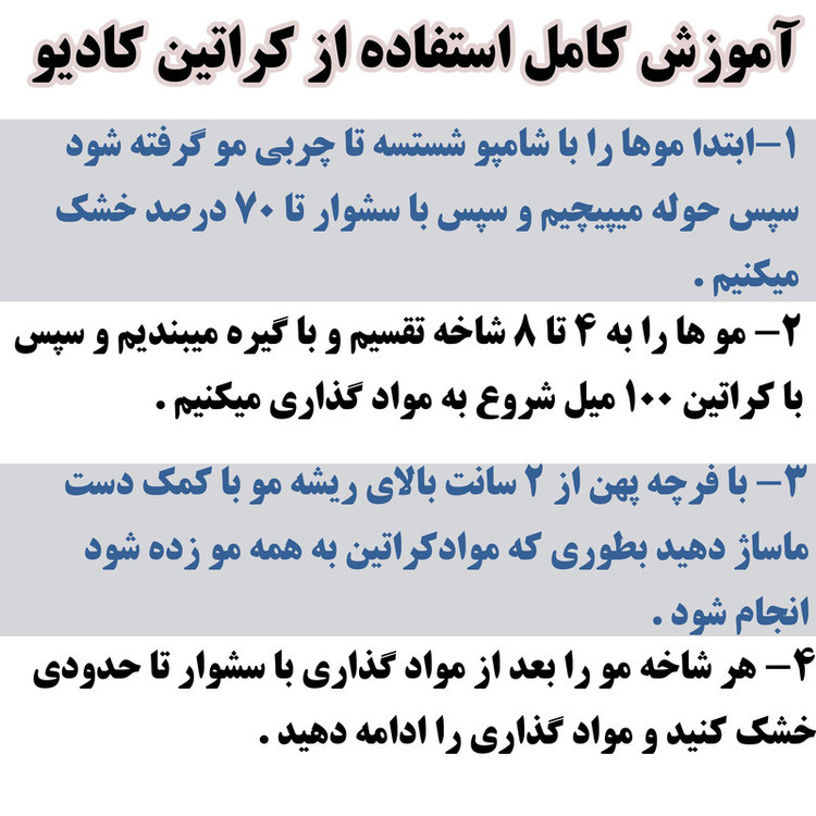 کراتین مو برزیل کاکائو کادیو تنها کراتین موجود در جهان است که 100% از ترکیبات گیاهی ساخته شده و فاقد فرمالدئید و گازهای سمی می باشد. کراتین کادیوو علاوه بر ویتامین های کراتین ، حاوی عصاره و تکه های کاکائو است و موجب می گردد حجم موهای شکسته شده، آسییب دیده و وزدار به طور چشمگیری کاهش یافته و به خوبی قادر به احیای مو می باشد. استفاده ی مداوم از رنگ مو و مواد دکلره سبب خشکی مو می گردد که به طبع آن شکستگی ، موخوره و وز موها به وجود می آید. استفاده از کراتین مو کادیوو قادر است به سرعت موها را تقویت و درمان نماید و مویی صاف و درخشان را به شما بازگرداند. بر خلاف کراتیه های موجود در بازار که سه روز پس از مصرف تغییرات موها قابل مشاهده است ، کراتینه مو کادیوو در کمتر از یک ساعت می تواند زیبایی و درخشندگی موها را بازگردانده و مویی صاف و یکدست به شما هدیه دهد. پس از استفاده از پک کراتین مو کادیو زمان حالت دهی به موها به 1/3 کاهش می یابد . به طور مثال اگر شما برای حالت دادن موهای خود پیش از کراتینه کردن به 45 دقیقه زمان نیاز داشتید.